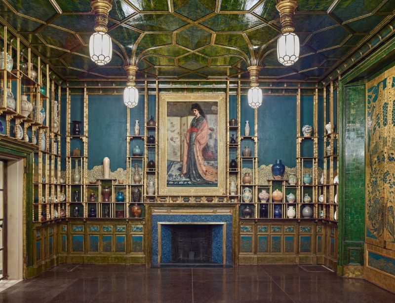 弗利尔美术馆自1923年起向公众开放,“孔雀屋”是镀金时代宏伟建筑的典范,配有镀金胡桃木搁板和舒缓的蓝绿色调以及奇妙的鸟类风格装饰。然而,它本不是像现在看起来的样子,它最初的主人是英国船商弗雷德里克·理查兹·利兰(Frederick Richards Leryland,1831-1892),他在1876年委托惠斯勒重新装饰他在伦敦家中的餐厅,这样他就可以展示他收藏的青花瓷器。利兰喜欢微妙的色调和复杂的表面纹理,但惠斯勒遵循他自己的奢侈愿景,将整间屋子漆成了金色和蓝色。最终,当度假回来时,他的赞助人大吃一惊。