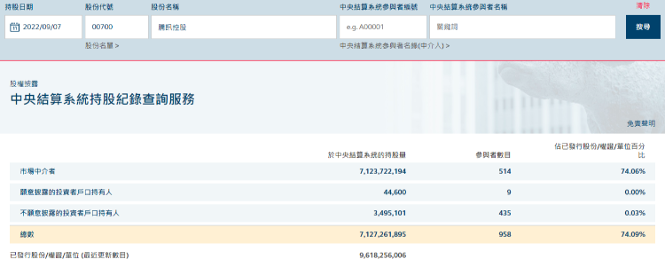根据香港交易所的数据,腾讯股东此前将1.93亿股股份转入了香港的中央结算系统。交易所数据显示,截至9月7日,在香港中央结算系统流通的股份总数占到腾讯已发行股份、权证和单位总数的74.09%,上升2个百分点。