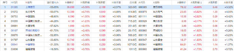 截至发稿,上海复旦A股涨8.99%,H股现涨5.59%;东方电气A股涨5.82%,H股现涨6.74%;中国国航A股涨2.82%,H股现涨1.67%。