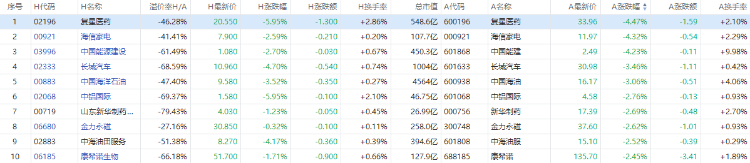 复星医药A股跌4.47%,H股现跌5.95%;海信家电A股跌4.32%,H股跌2.59%;中国能建A股跌4.23%,H股跌2.7%。