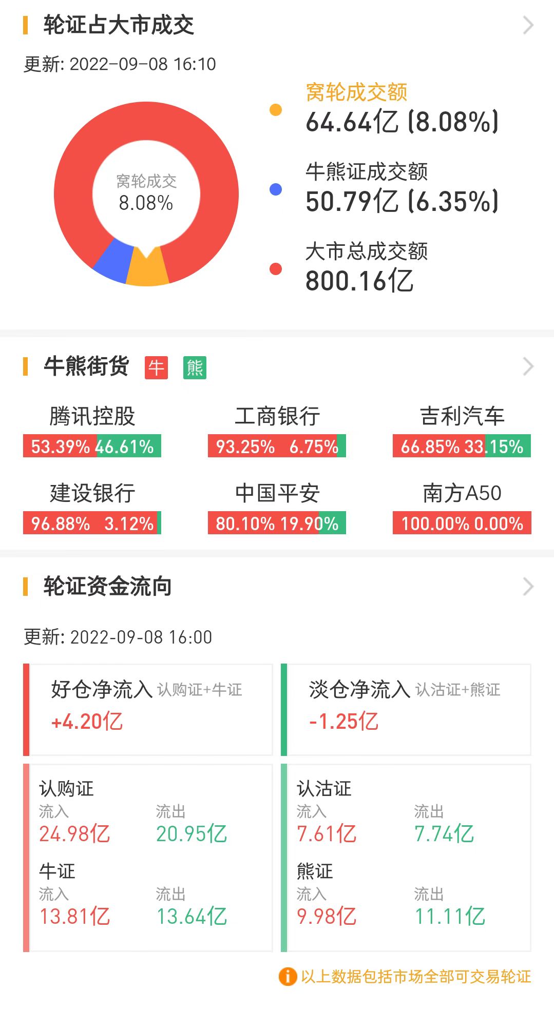 其中,窝轮总成交额为64.64亿港元,牛熊证总成交额为50.79港元。
