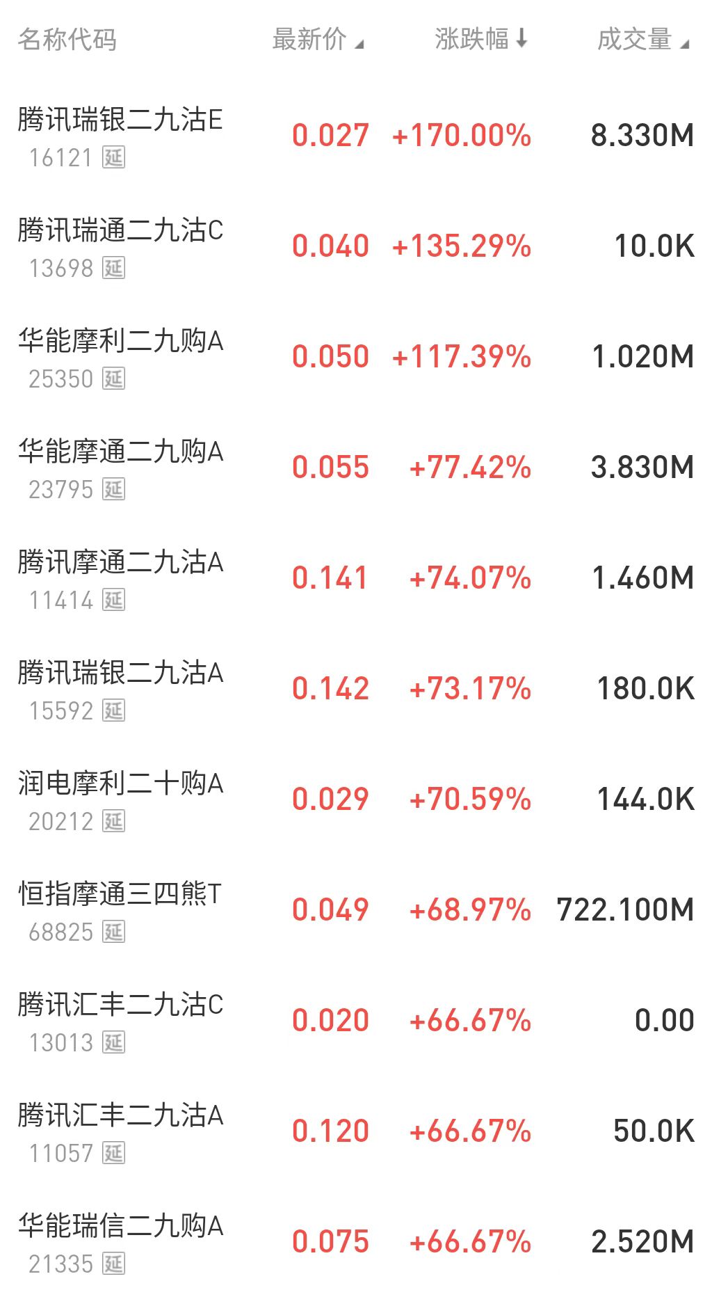 在今日涨幅榜中,腾讯瑞银二九沽E $16121.HK 涨170%,华能摩利二九购A $25350.HK 涨117.39%,此外,润电摩利二十购A $20212.HK 涨70.59%。