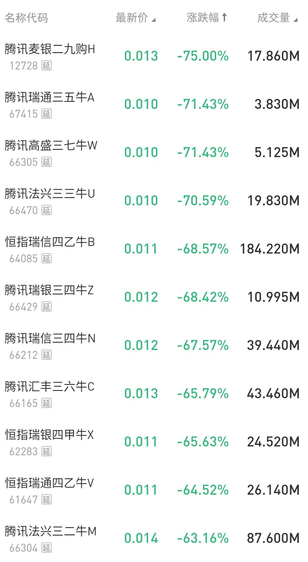 在今日跌幅榜中,腾讯麦银二九购H $12728.HK 跌75%;恒指瑞信四乙牛B $64085.HK 跌68.57%。