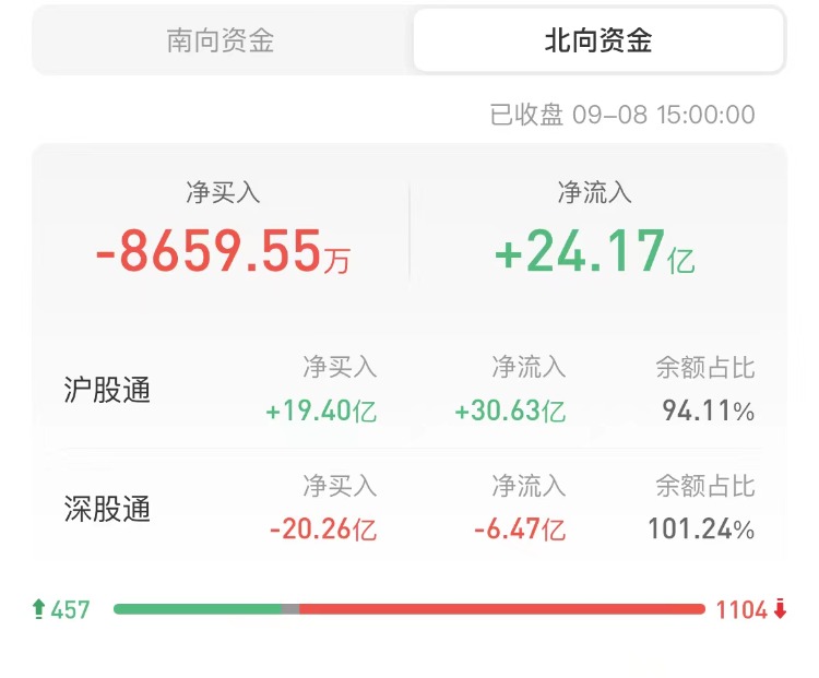 北上资金今日净卖出0.866亿元,沪股通净买入19.4亿元,深股通净卖出20.26亿元。上一交易日净卖出33.74亿元。