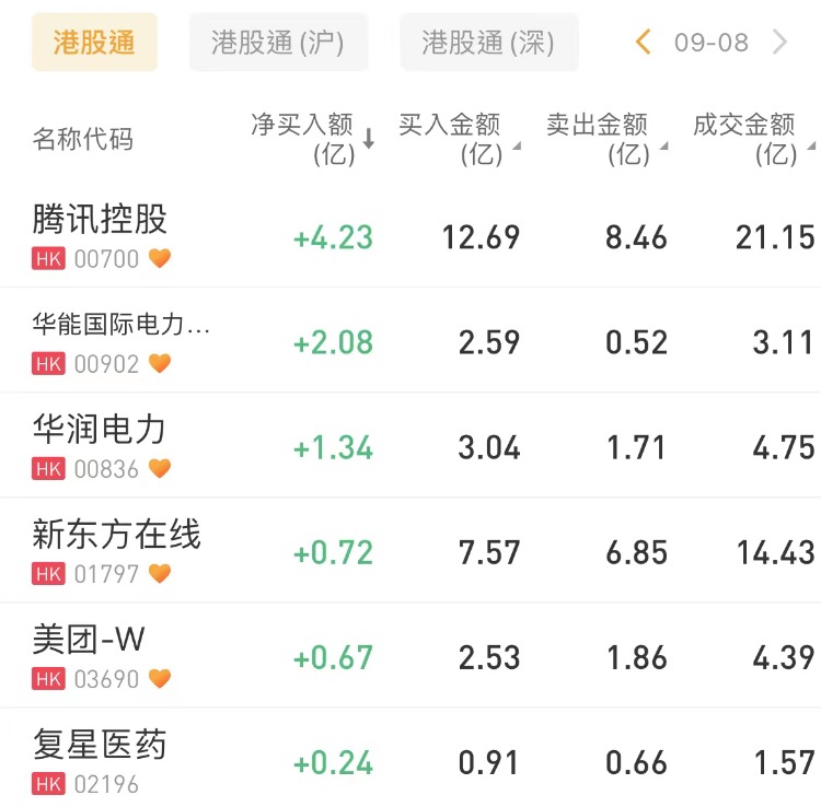 南下资金净买入腾讯控股 $00700.HK 4.23亿港元,为今日买入之最,净买入华能国际电力 $00902.HK 2.08港元。此外,华润电力 $00836.HK 获净买入1.34亿港元,新东方在线 $01797.HK 也获净买入0.72亿港元。