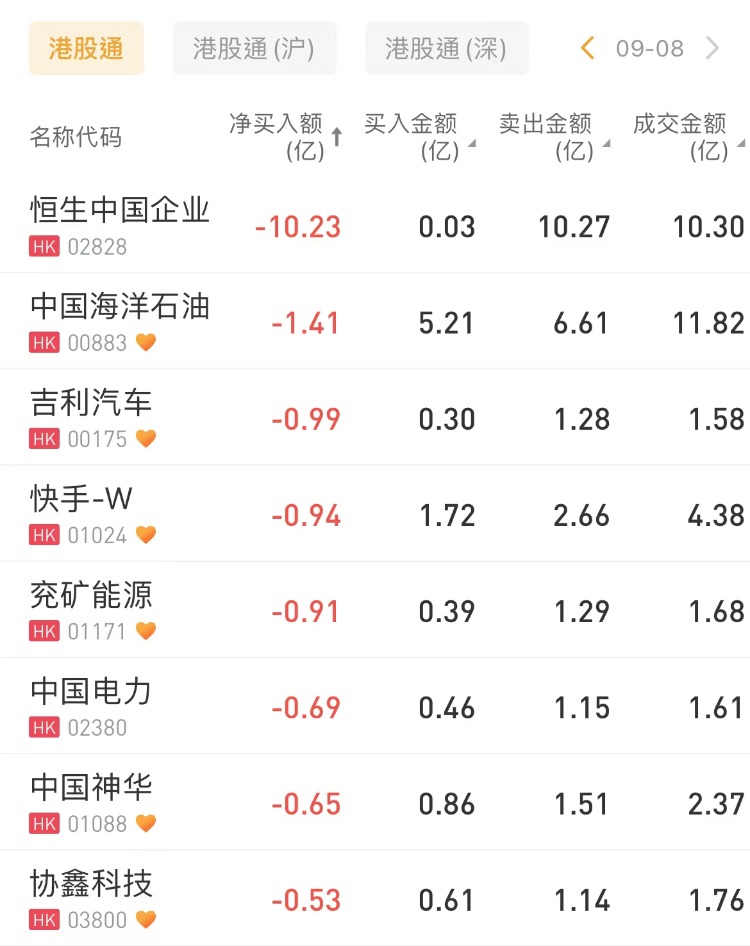 南下资金净卖出恒生中国企业 $02828.HK 10.23亿港元,为今日卖出之最,净卖出中国海洋石油 $00883.HK 1.41亿港元,吉利汽车 $00175.HK 遭净卖出0.99亿港元。