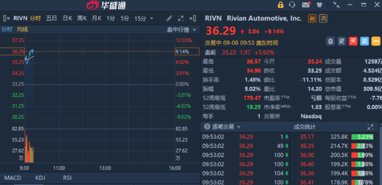 华盛资讯9月8日消息,美股盘初,新能源车板块多数下挫,截至发稿,Rivian $RIVN 涨超9%,报36.29美元,成交额4.524亿美元。消息面上,梅塞德斯-奔驰和Rivian将在欧洲的联合工厂生产面包车。两家公司设想在普通装配线上进行生产优化的车辆设计,以实现高效制造。