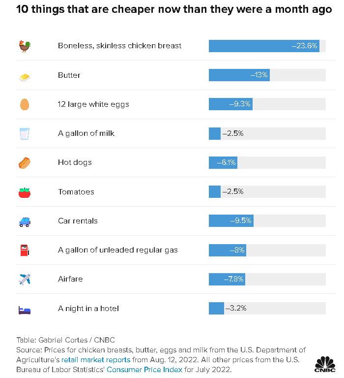 CNBC汇编的数据显示,过去一个月,禽类和乳制品等主要消费品的价格,以及汽车租赁和酒店住宿等服务的价格都在下降。BOOX预计,8月份CPI数据将出现环比下降,从而对年化CPI造成重大冲击。
