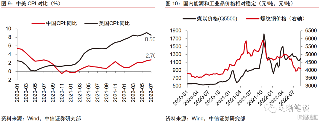 中国通胀压力显著弱于美国。7月中国CPI同比增速为2.7%,PPI同比增速为4.2%;而美国7月的CPI和PPI同比则分别为8.5%和17.2%。国内通胀压力较小的原因有二:一是保供稳价政策有力执行:煤炭保供稳价意味着能源价格平稳,一些工业品价格也逐步回归历史均值区间。二是过去两年中国疫情控制较好,财政、货币政策较为克制,没有造成经济过热的局面。