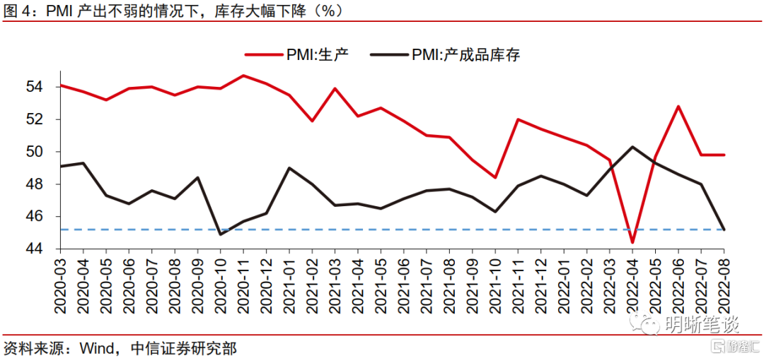 主动去库还是被动去库?8月制造业PMI各项指标中,产成品库存指数的大幅下行是比较超预期的。市场上有观点认为,这是需求不景气环境下厂商的主动去库行为。诚然,这一观点比较符合线性外推的逻辑,也是当前经济环境下比较自然的想法,但却不符合数据逻辑:主动去库存,硬币的另一面是减少生产。若生产没有下降,库存下降,那就是需求起来了,是被动去库而不是主动去库。