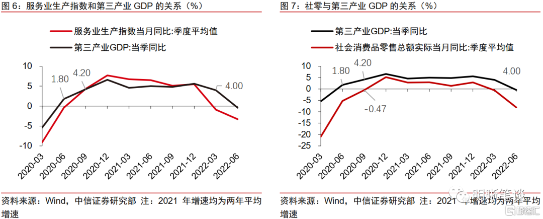 上述两个因素,意味着在三季度工业增加值、实际社零、实际投资增速都不到4%的情况下,GDP有可能实现4%左右的增长。如果观察月度经济指标和季度GDP的关系,历史上类似的情况也并不鲜见。