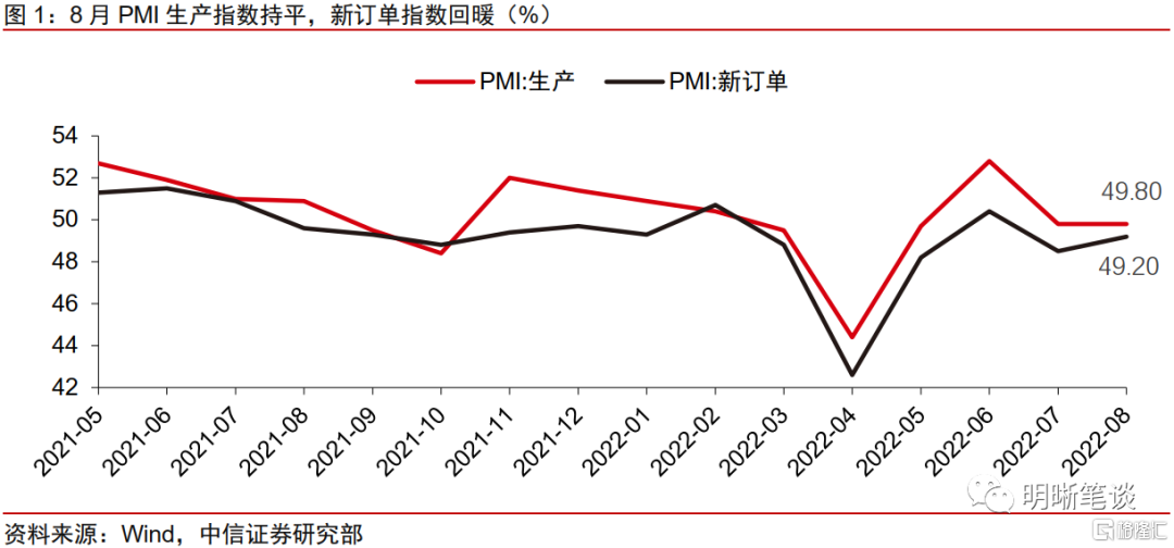8月制造业产出增速的下降幅度可能不大。8月PMI生产指数维持49.8%,与7月持平,新订单指数小幅上行至49.2%。虽然PMI产需的数字本身并不算靓丽,但出现在南方部分地区面临限产限电月份,可能意味着制造业产需并没有市场想象的那样悲观。