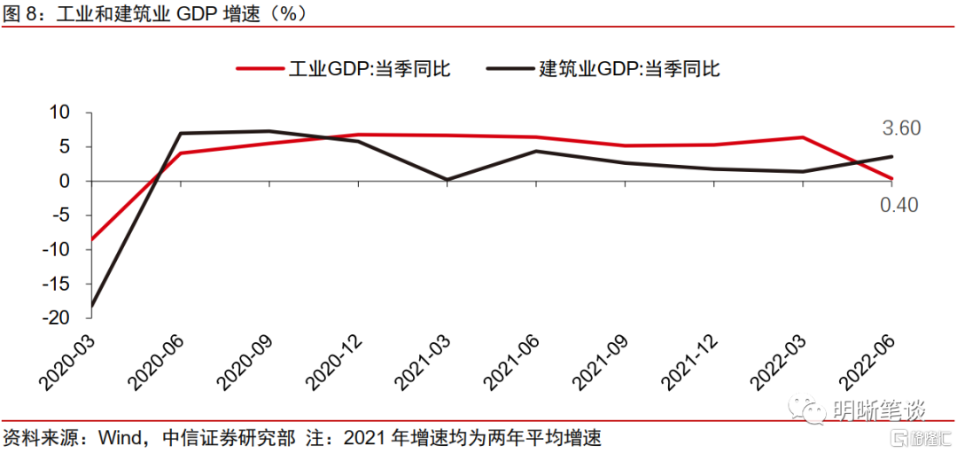 建筑业GDP增速可能被低估。在当前房地产市场需求相当低迷的情况下,加之钢铁、水泥需求疲软,市场对于建筑业的直观认识似乎趋于悲观。但实际上,今年二季度建筑业GDP增速是显著高于工业增加值增速的。考虑到三季度基建投资或将进一步上升,叠加三季度建筑业GDP基数下降,在第二产业中占比超过10%的建筑业,其GDP的增速可能显著快于工业。这也意味着三季度第二产业增加值增速很可能高于工业增加值增速。