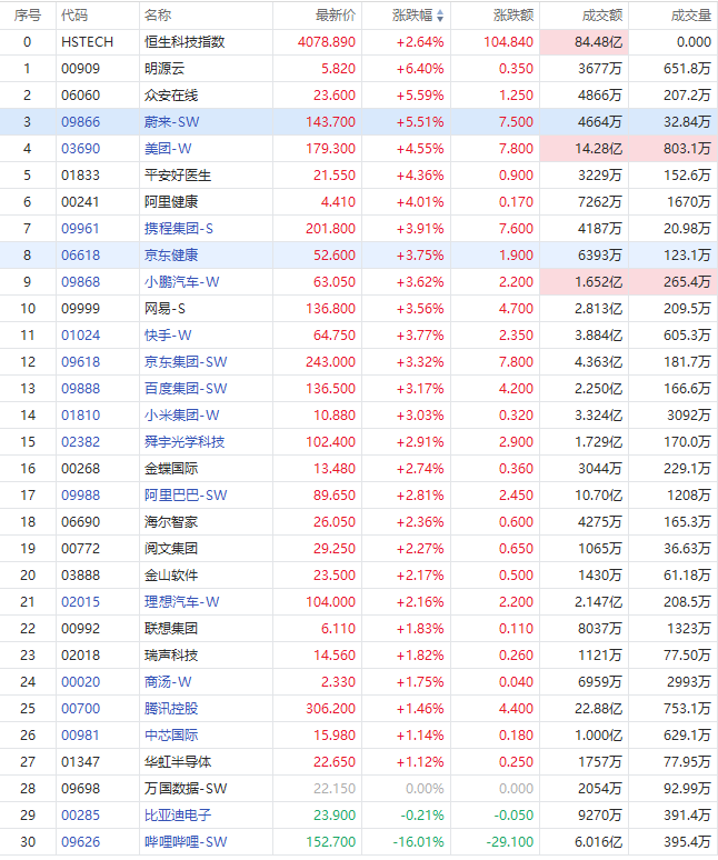 科网股多数走强,截至发稿,美团-W涨4.32%,携程集团-S涨超4%,网易-S、快手-W涨超3%,阿里巴巴-SW涨2.58%,腾讯反弹涨1.26%