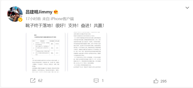 消息发布后,「牙茅」通策医疗一字涨停。通策医疗董事长昨晚在政策发布后连夜截图发微博,表示「靴子终于落地!很好!支持!奋进!共赢!」