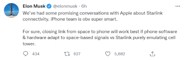 SpaceX与苹果 $AAPL 强强联手?马斯克:已就星链与iPhone合作进行了讨论