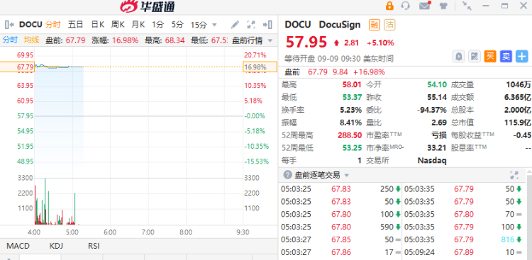 截至北京时间17:13,DocuSign盘前涨近17%,报67.79美元。公司Q2营收同比增长21.6%至6.22亿美元,预计Q3营收6.24亿-6.28亿美元,同比增长15%。