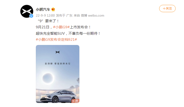 据小鹏汽车官微,小鹏G9上市发布会时间定于9月21日。