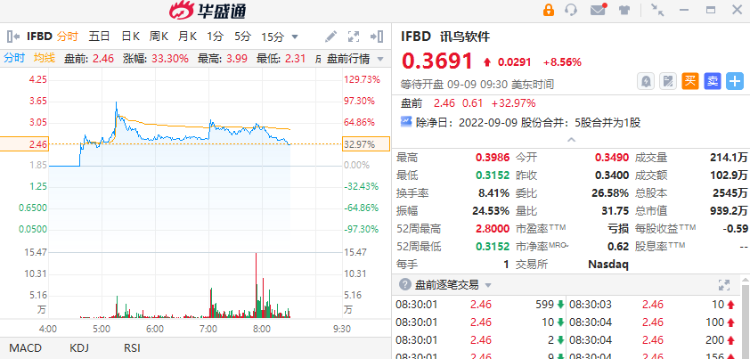截至北京时间20:30,讯鸟软件盘前大涨近33%,报2.46美元。讯鸟宣布“5合1”并股,公司计划对普通股实施1比5的股份合并,自2022年9月9日起生效。自2022年9月9日开盘起,公司普通股将在纳斯达克资本市场进行股票合并后交易,交易代码保持不变,为“IFBD”,但新的CUSIP编号为G47724201。 股份合并的目的是使公司能够重新遵守纳斯达克市场规则 5550(a)(2)并维持其在纳斯达克资本市场的上市。