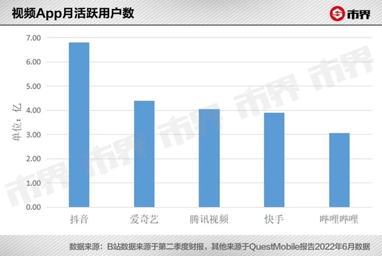 但无论对手是谁,B站的用户规模还不够大。据QuestMobile数据,2022年6月,快手、腾讯视频、爱奇艺的月活跃用户数均在4亿左右,抖音月活跃用户更是接近7亿。