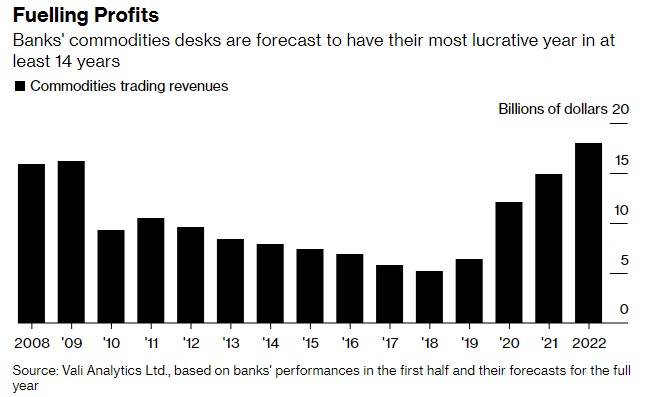 智通财经注意到,今年全球最大的几家银行有望在大宗商品领域大赚一笔,超过金融危机期间创下的纪录。根据伦敦Vali Analytics的数据和估计,到2022年底,收入最高的100家银行将从大宗商品交易中赚取180亿美元。这将是14年来的最高水平,并超过2009年的最高利润。