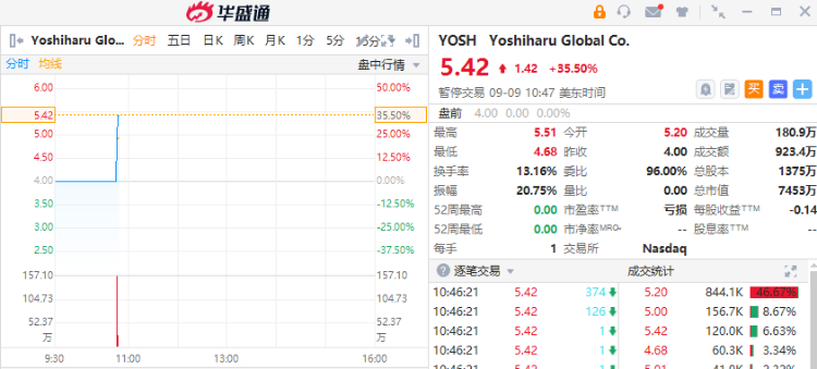 华盛资讯9月9日消息,餐厅运营商Yoshiharu Global于今日登陆纳斯达克,首挂涨超35%,触发熔断,成交额超900万美元。