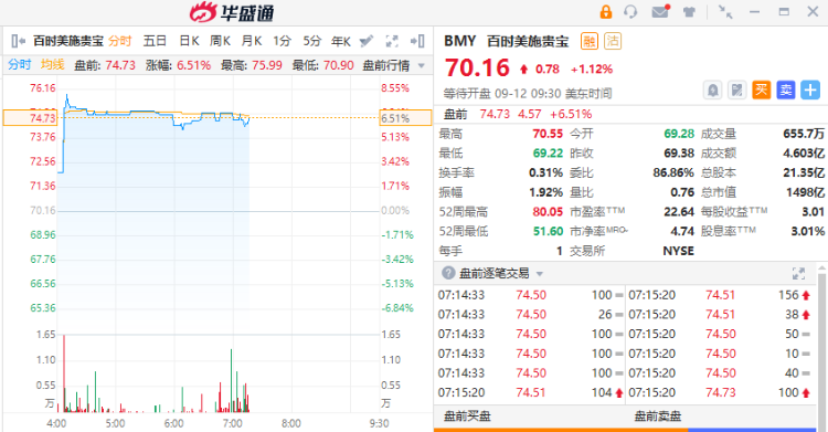 智通财经APP获悉,百时美施贵宝(BMY.US)股价于周一美股盘前大幅走高,此前该公司获得FDA批准推出一款名为Sotyktu的新型银屑病治疗药物。截至发稿,该股盘前涨6.51%至74.73美元,盘前一度涨超8%。