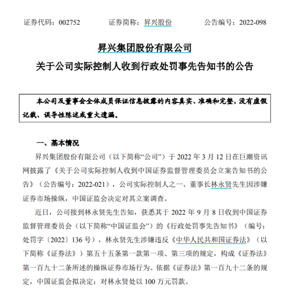 9月12日,?兴股份发布公告,称近日公司接到实控人林永贤告知,获悉其于2022年9月8日收到中国证监会的《行政处罚事先告知书》(编号:处罚字〔2022〕136号),林永贤涉嫌违反《中华人民共和国证券法》第五十五条第一款第一项、第三项的规定,构成《证券法》第一百九十二条所述的操纵证券市场行为。依据《证券法》第一百九十二条的规定,中国证监会拟决定:对林永贤处以100万元罚款。