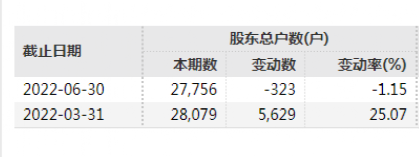 股东户数方面,截至6月30日,期末公司股东总户数为27756户,相较于今年一季度末较减少了1.15%。