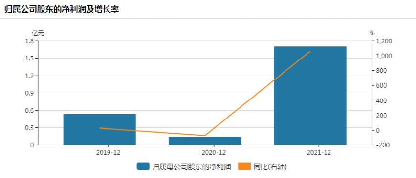 从财报数据来看,近三年公司营收保持稳增长,但净利方面出现较大波动。2019年至2021年营收分别为25.49亿元、29.03亿元、51.66亿元,同比分别增长21.50%、13.87%、59.66%;归母净利润方面,2020年为0.14亿元,同比下降了74.48%,2021年为1.7亿元,同比猛增1059.26%。
