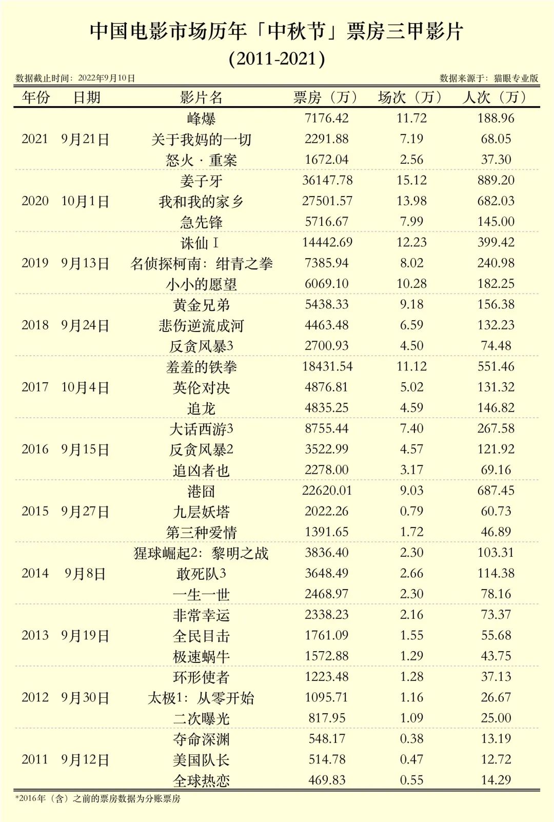 附:历年「中秋节」单日票房及三甲影片票房(2011-2021)