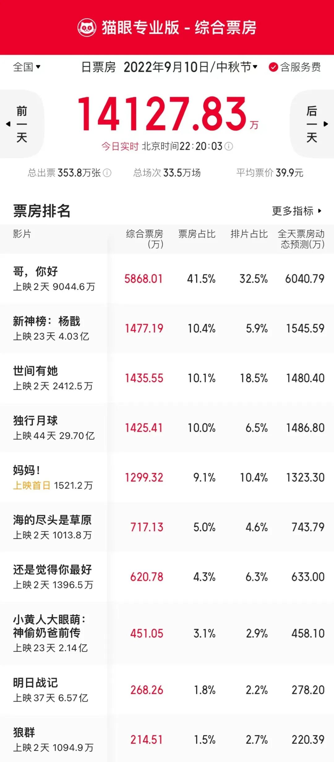 猫眼专业版数据见证,9月10日22时20分,2022年中秋节(9月10日)单日票房破1.4亿