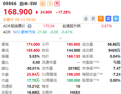 华盛资讯9月13日消息,汽车股多数向上,蔚来冲高涨超17%,报168.9港元。长城汽车(02333)涨2.28%,小鹏汽车(09868)涨1.75%,比亚迪股份(01211)涨1.62%。