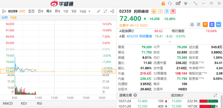 今日CXO概念板块大跌,截至发稿,药明康德跌超12%,报72.4港元;凯莱英跌近12%,康龙化成跌近11%。药明康德人士9月13日上午向记者表示,“公司业务和运营一切正常。”
