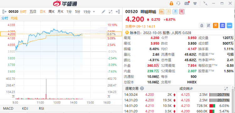 截至发稿,呷哺呷哺涨近7%,报4.2港元,换手率1.1%。周黑鸭涨近5%,海伦司、海底捞涨近4%,百胜中国涨超2%,谭仔国际涨超1%。