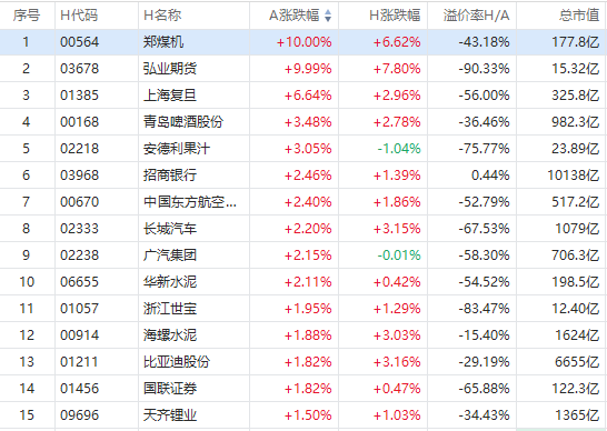 截至发稿,郑煤机A股涨停,H股现涨6.62%;弘业期货A股涨停,H股现涨7.8%;上海复旦A股涨6.64%,H股现涨2.96%。