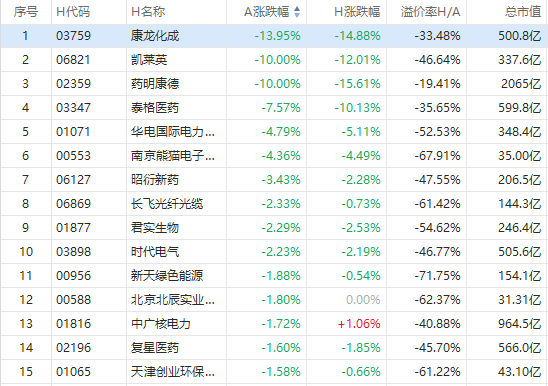 康龙化成A股跌13.95%,H股现跌14.88%;凯莱英A股跌停,H股跌12.01%;药明康德A股跌停,H股跌15.61%。