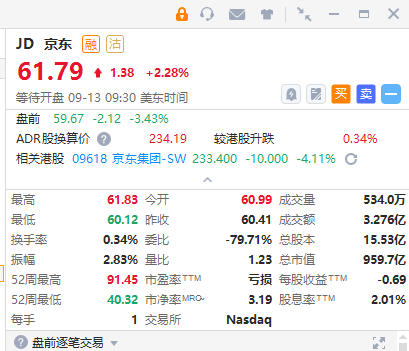 华盛资讯9月13日消息,美股盘前,三大期指上扬,截至发稿,道指期货涨0.43%,标普500指数期货涨0.46%,纳指期货0.43%。中概股盘前部分走低,京东、哔哩哔哩跌超3%,唯品会、阿里巴巴跌近2%,拼多多、蔚来汽车跌约1%。