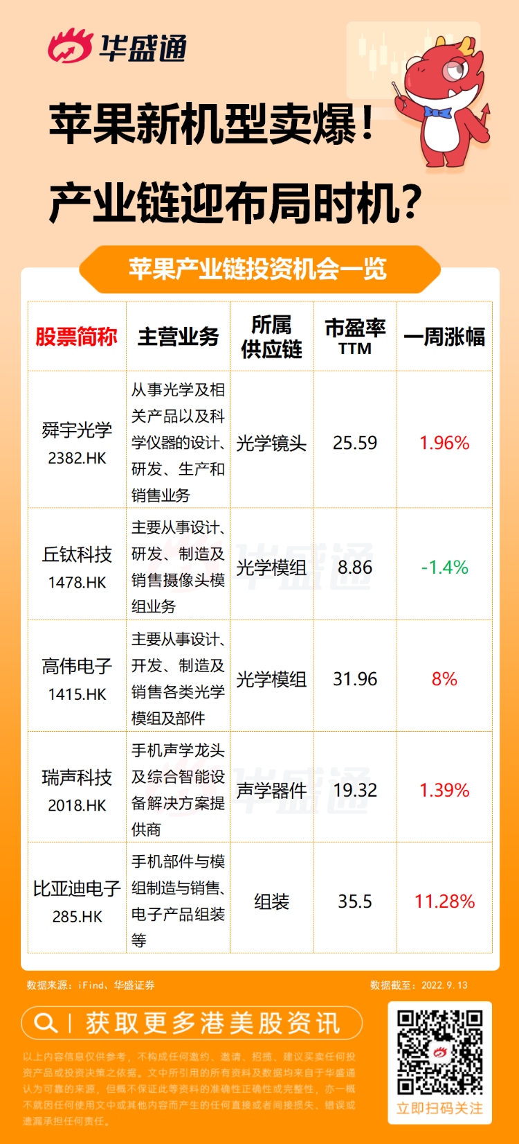 丘钛科技为苹果供应手机摄像头模组,产品包括分辨率介于300万像素至2000万像素之间的变焦及定焦摄像头模组,带广角镜、大光圈、双摄像头、OIS、PDAF、手势识别、及闭环控制功能的超薄摄像头模组。中泰国际认为随着OIS下沉、苹果有望引领大光圈潜望镜、苹果有望引领前摄由FF转变为AF等机遇,有望在今年末及明年有所提升。
