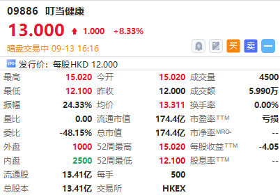 华盛资讯9月13日讯,互联网医疗服务商叮当健康 $09886.HK 暗盘现涨8.33%,一手账面浮盈500港元,最新总市值超174亿港元。该股预计将于明日(9.14)正式港股挂牌上市。