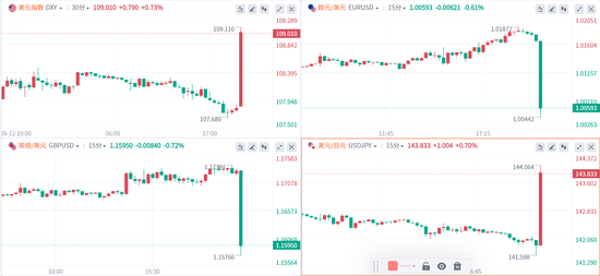 美元指数持续走高,在CPI数据公布后拉升超120点,突破109,日内涨0.73%。非美货币跌幅扩大,英镑兑美元短线下挫近150点,欧元兑美元短线下挫120点,美元兑日元向上触及144,日内涨0.82%。美国2年期和10年期国债收益率差扩大至24.7个基点。纳指期货迅速跌超2%,道指期货、标普500指数期货分别跌1.1%和1.5%,美股大型科技股盘前集体下挫。