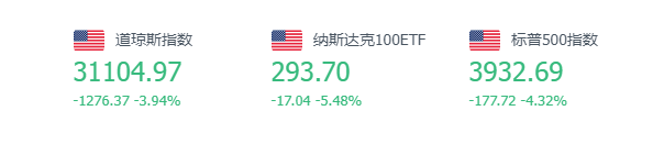 道指跌3.94%报31104.97点,标普500指数跌4.32%报3932.69点,纳指跌5.16%报11633.57点。