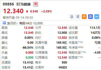 华盛资讯9月14日讯,互联网医疗服务商叮当健康 $09886.HK 首挂高开2.83%,盘前成交额1427万港元,最新总市值超165亿港元,昨日暗盘收涨0.83%。