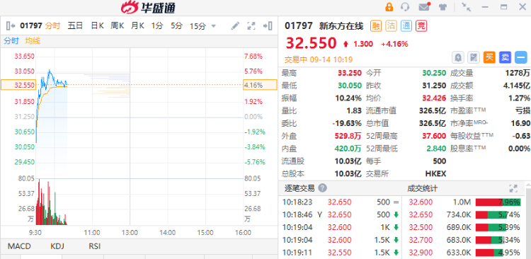 华盛资讯9月14日消息,新东方在线逆市上涨,截至发稿,新东方在线涨超4%,报32.55港元,成交额4.145亿港元。