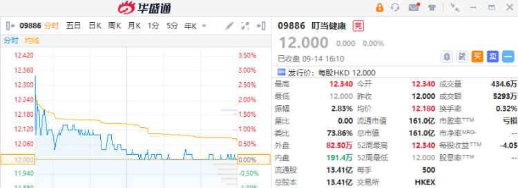 华盛资讯9月14日讯,互联网医疗服务商叮当健康 $09886.HK 首挂高开2.83%,尾盘平收,全日成交额5293万港元,最新总市值超161亿港元。