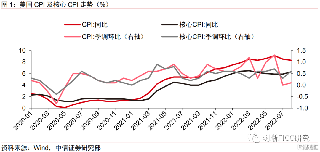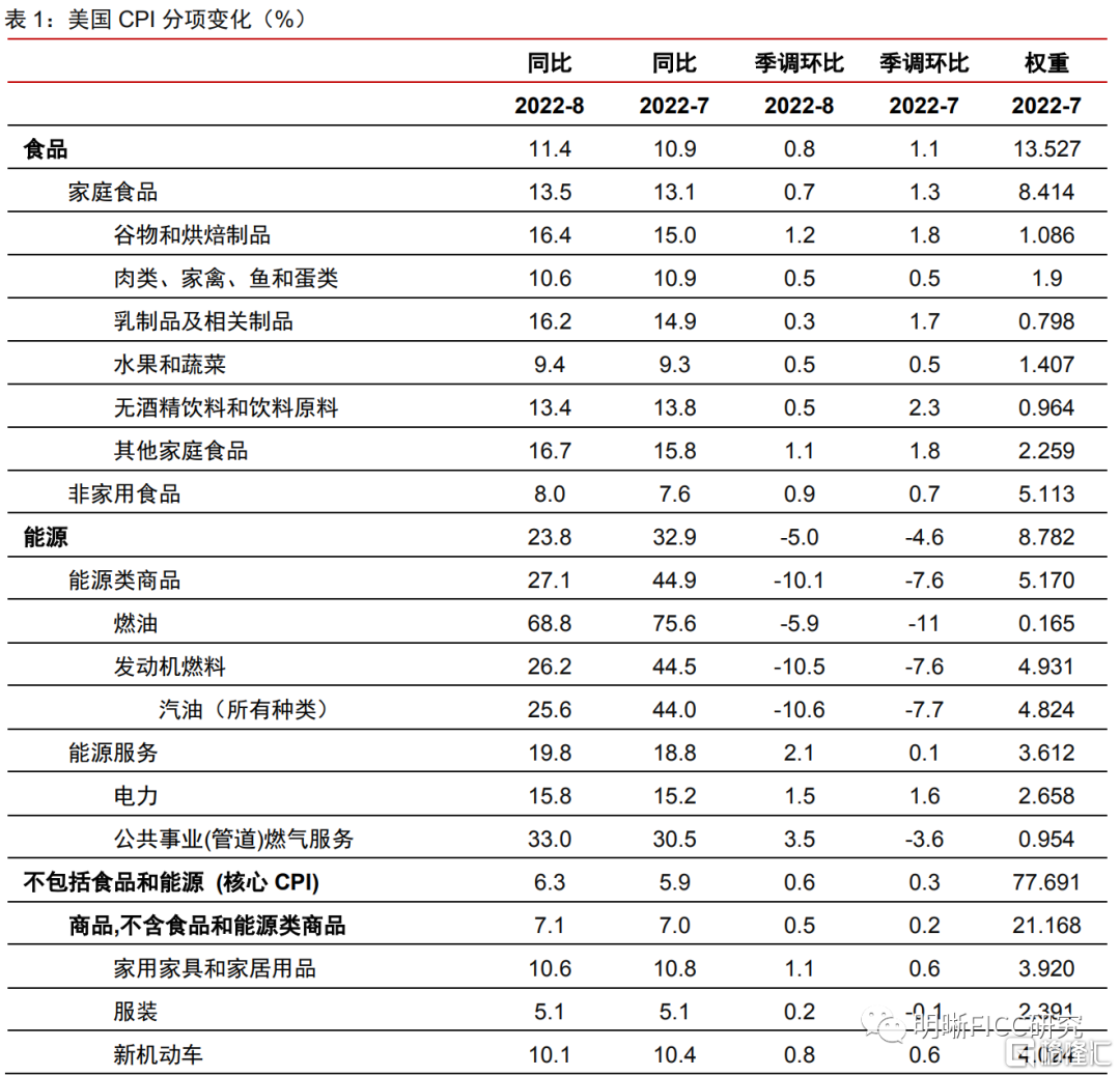 美国8月未季调CPI同比升8.3%,增速下降但高于预期;未季调核心CPI同比升6.3%,增速上升且高于预期。8月,CPI同比为8.3%,较上月低0.2%,但高于市场预期的8.1%。CPI环比录得0.1%,较上月上升0.1%,高于市场一致预期的-0.1%。核心CPI同比增速为6.3%,较上月上升0.4%,高于6.1%的预期,核心CPI环比增速由0.3%上升至0.6%。
