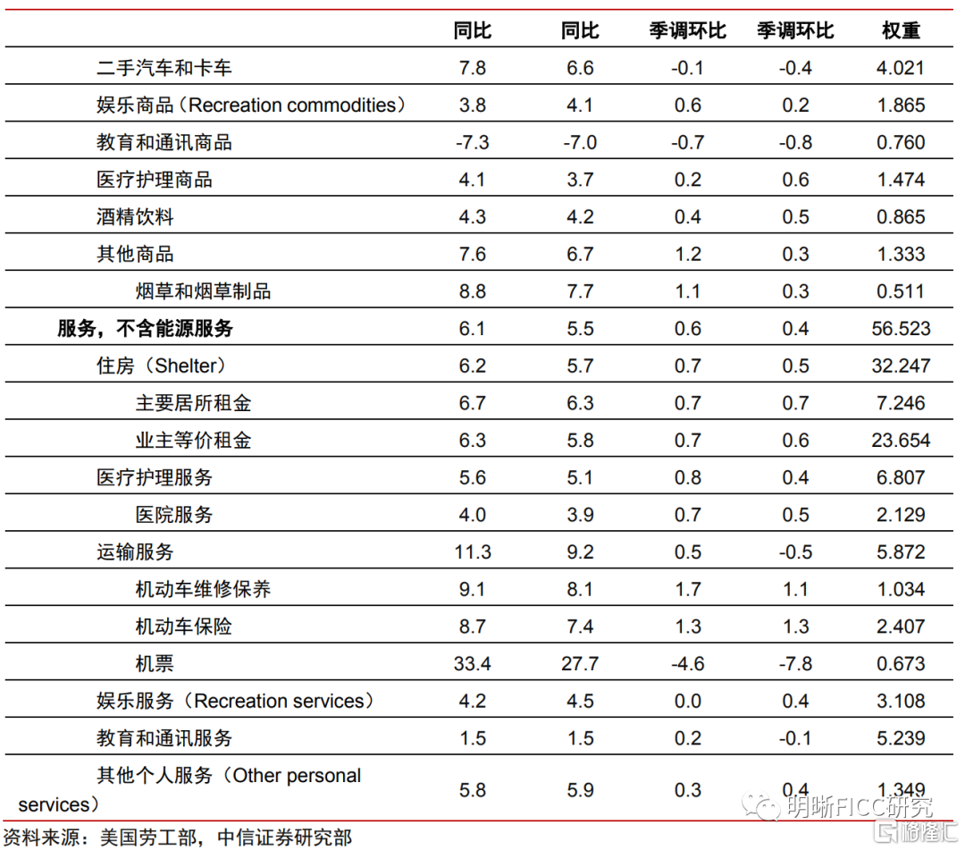 从除了住房项以外的核心CPI分项来看,核心商品环比较大幅上升,尤其是家用家具和家居用品项、新机动车项,显示出消费动力仍较强,在薪资增长较强的背景下,除了住房项以外的核心服务项环比也进一步上涨。分项来看,虽然服装、鞋子等部分商品环比增速放缓趋势仍存,二手车项也和领先指标Manheim二手车价值指数显示的下降趋势一致,但家用家具和家居用品项、新机动车项环比进一步上升,反映出虽然全球供应链压力在8月进一步缓解,但美国消费需求仍较强,能源价格下降或又推动了居民消费支出。同时,新机动车项库存仍较低,供不应求现象仍较严重。另一方面,虽然由于能源价格下跌,机票价格继续下降,但劳动力市场较强劲增长,高薪资增速仍支撑核心服务项通胀,使其较难快速回落。