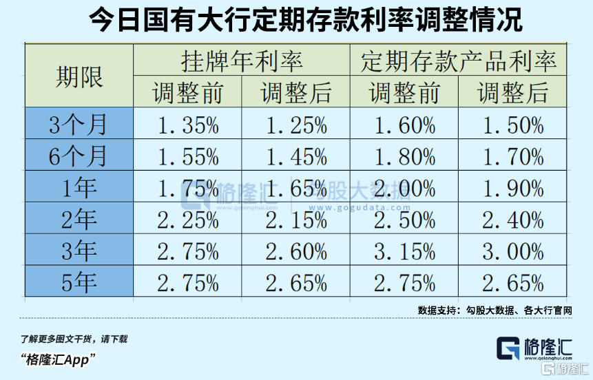 此外,除了国有大行外,通过招商银行App可以看到,招行的3个月、6个月、1年期、2年期和5年期定期存款利率分别为1.25%、1.45%、1.65%、2.15%、2.65%,与国有大行相同,均较之前下降10个基点;3年期定期存款利率为2.60%,下降了15个基点。