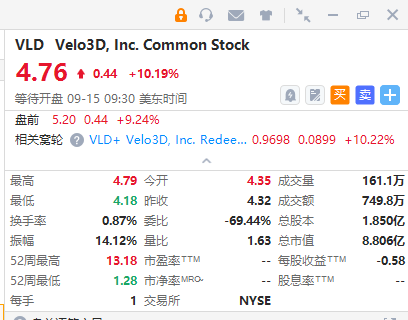 昨日大涨10%的Velo3D $VLD 今日盘前再涨9.24%,报5.2港元。资料显示,该股在9月8日获BASS CARL、Idelchik Michael等多位董事净买入12.69万股。