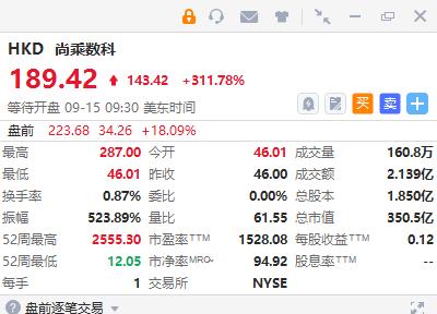 华盛资讯9月15日消息,美股盘前,三大期指走低,截至发稿,纳指期货转跌0.01%。尚乘数科盘前拉涨,涨超18%,报223.68美元,该股隔夜上涨超300%再次吸引投资者目光。